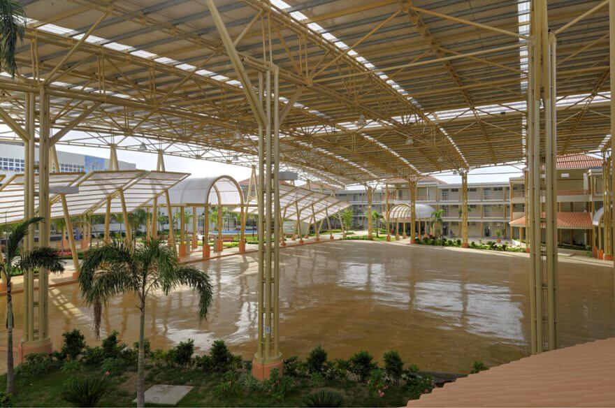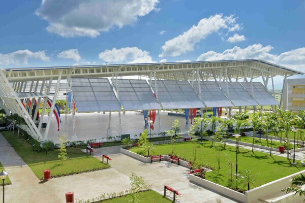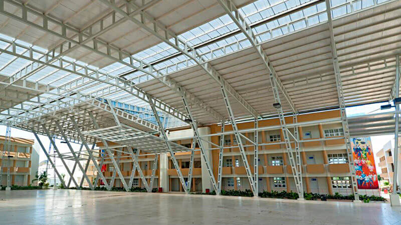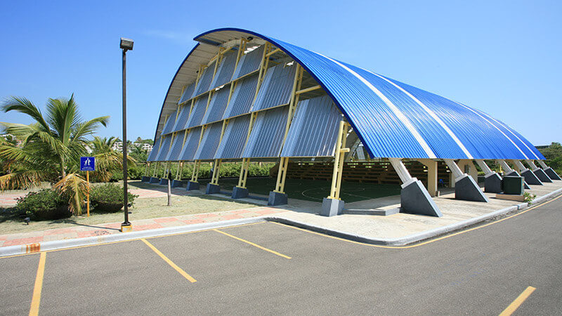 El proyecto incluye obra civil y fabricación e instalación de estructuras metálicas para el techo de la plazoleta multiuso, la cancha con cubiertas en Aluzinc Estrella, el puente peatonal y la estructura que soporta la edificación del auditorio de la casa de estudios.